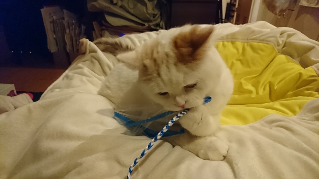 新しいおもちゃをはむはむする猫様(8歳)。