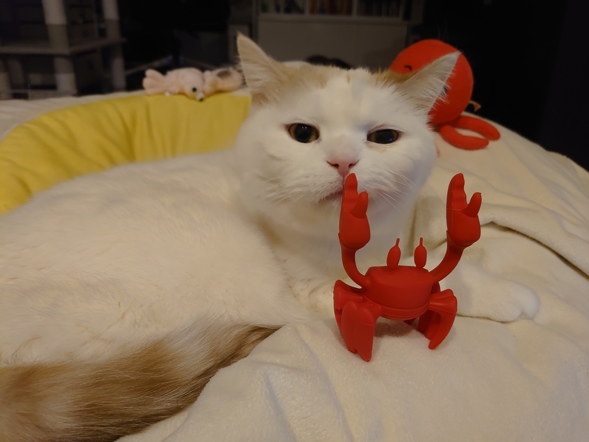 よくよく見ると、猫様の周りにタコ、イカ、エビのぬいぐるみが置いてあるので、カニも加わったら海の幸大集合状態じゃん!?まさにオーシャン状態!!!